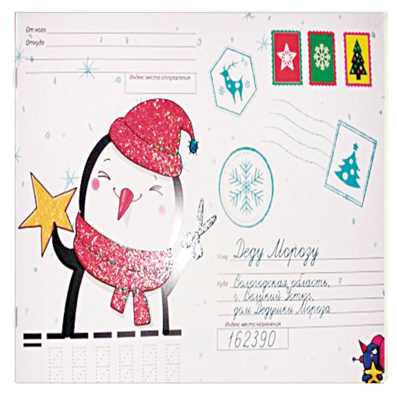 Внутри этого волшебного конверта малыш найдёт всё необходимое для подготовки к празднику. Его ждут весёлые раскраски с заданиями, рецепты, поделки и бланк для письма Деду Морозу! Конверт поможет сделать праздник по-настоящему сказочным.
