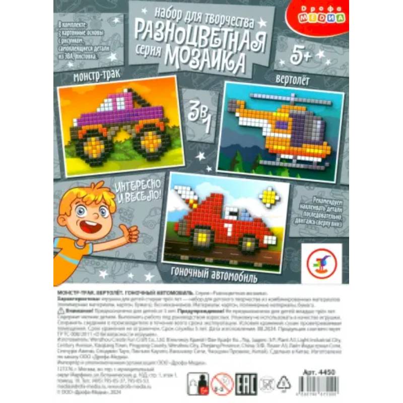 Детали мозаики выполнены в виде квадратиков из мягкого пластика ЭВА. Размер одного элемента - 7х7 мм. Работать с аппликацией очень просто - на основе уже отмечены места для приклеивания деталей, нужно подобрать подходящий по цвету элемент, снять его с общего блока и наклеить. Клей и ножницы не понадобятся! Ребёнок легко справится самостоятельно, помощь взрослого будет сведена к минимуму. В итоге у ребёнка получится три эффектные картинки в технике пиксель арт.