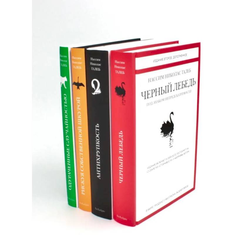 Комплект из 4-х книг известного эссеиста, математика и трейдера Нассим Николаса Талеба. В сферу его интересов входит эпистемология (раздел философии, изучающий основания знаний) случайности, а также междисциплинарные задачи на неопределенность и знание, особенно в связи с серьезными, трудно предсказуемыми событиями. Одним из первых заинтересовался механизмами торговли производными финансовыми инструментами.